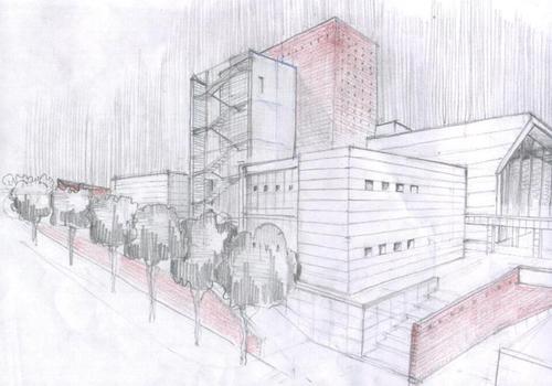 Il progetto affida inoltre al sistema strutturale degli architravi del porticato il disegno degli spazi esterni. Gli architravi sono intonacati con lo stesso disegno presente sulle facciate degli edifici . Il vetro alternato a regoli di acciaio lo si ritrova nelle facciate del foyer e del bar ristoro disegnato in continuità delle fasce intonacate in modo tale da conferire unitarietà allinvaso. Al suo interno, la sala auditorium è interamente rivestita di pannelli di legno che rendono la sala ovattata sul piano acustico, oltre a conferire alla stessa un aspetto sobrio ed elegante. I pannelli leggermente inclinati sia sul soffitto che sulle pareti laterali ai corridoi garantiscono una perfetta qualità di ascolto da ogni postazione, oltre che una diffusione sonora amplificata.