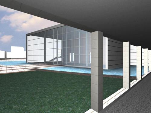 La struttura teatrale polivalente si immerge in vasche dacqua e si protegge dietro alberature di alto fusto che fanno da cornice ad una serie di allestimenti nel verde, piccole piazze pavimentate, giochi dacqua, che rappresentano lideale continuità visiva tra le emergenze naturalistiche presenti sul territorio ( il mare, il fiume, il parco Naturalistico Archeologico di Vulci),