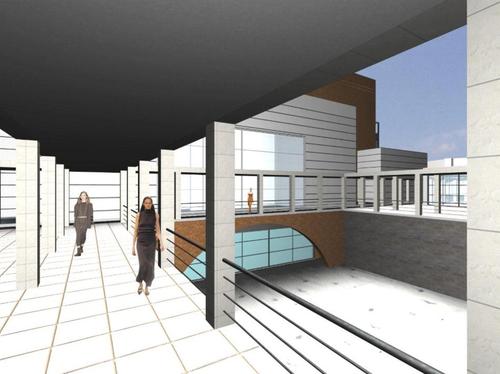Pilastri rastremati, promenade coperte, superfici vetrate , specchi dacqua, parterre verdi, alte alberature, costituiscono gli elementi caratterizzanti il nuovo centro cittadino collocato inaspettatamente tra la stereotipa monotonia di parallelepipedi residenziali.